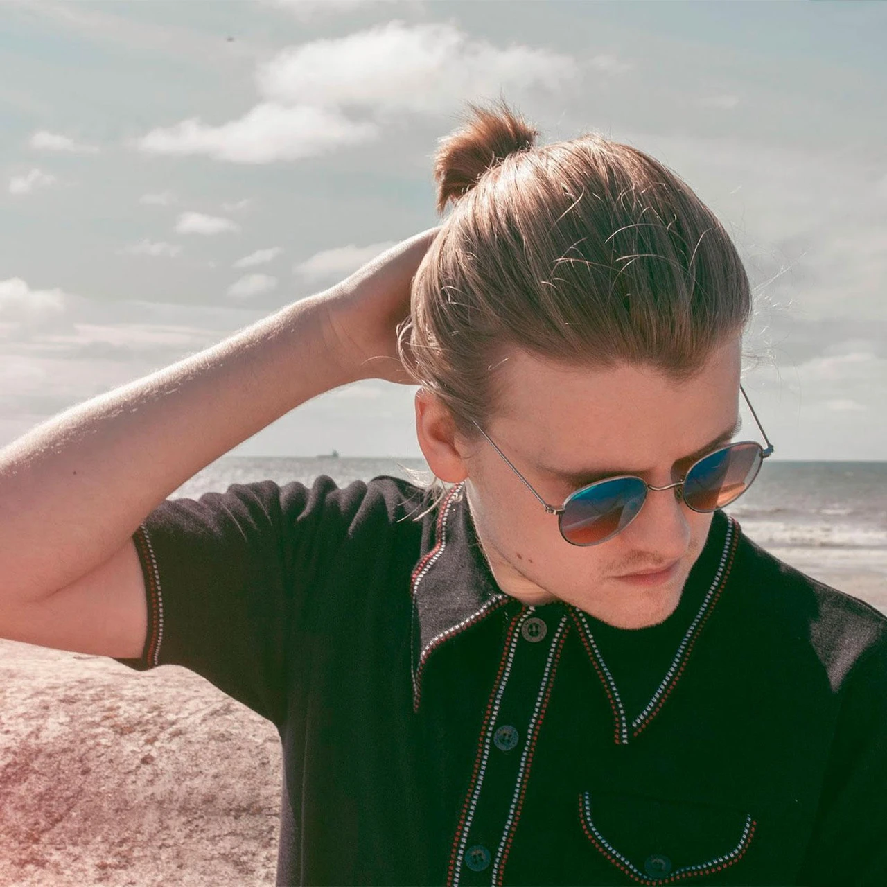 - Retro micro-dash jacquard trim to placket, collar and cuffs.