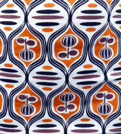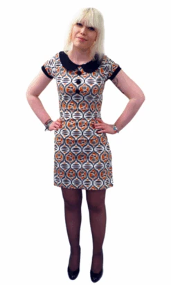 ‘DOLLIEROCKER AZTEC’ RETRO SIXTIES PETER PAN COLLAR MOD DRESS – Ecru, burnt orange, black and brown Mod Aztec print dress with Retro Sixties Peter Pan collar, 3 covered button detail, zip fasten to reverse. Slight stretch to fabric.