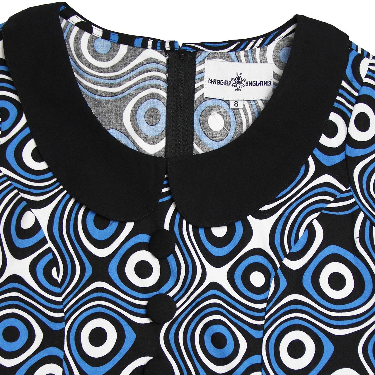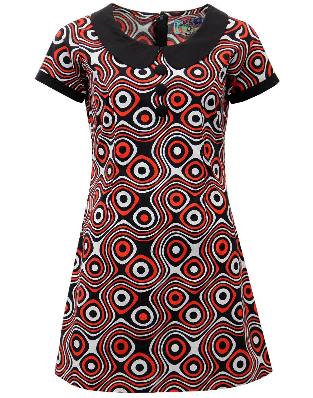 Key Points: Madcap England ‘Dollierocker Op Art’ psychedelic print dress with Peter Pan Collar and covered button details.