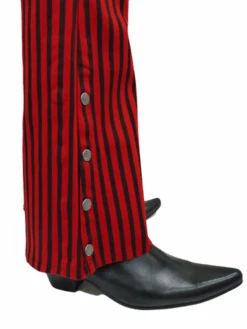 ‘DUKE’ RETRO MENS STRIPED BOOT CUT FLARES BY MADCAP ENGLAND – Madcap England Mens Retro Sixties/Seventies style Red and Black Striped Boot cut flares with press stud bottoms. Button waist. Zip fly. Low rise (hipster) waist. Pockets to front and reverse.