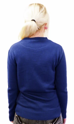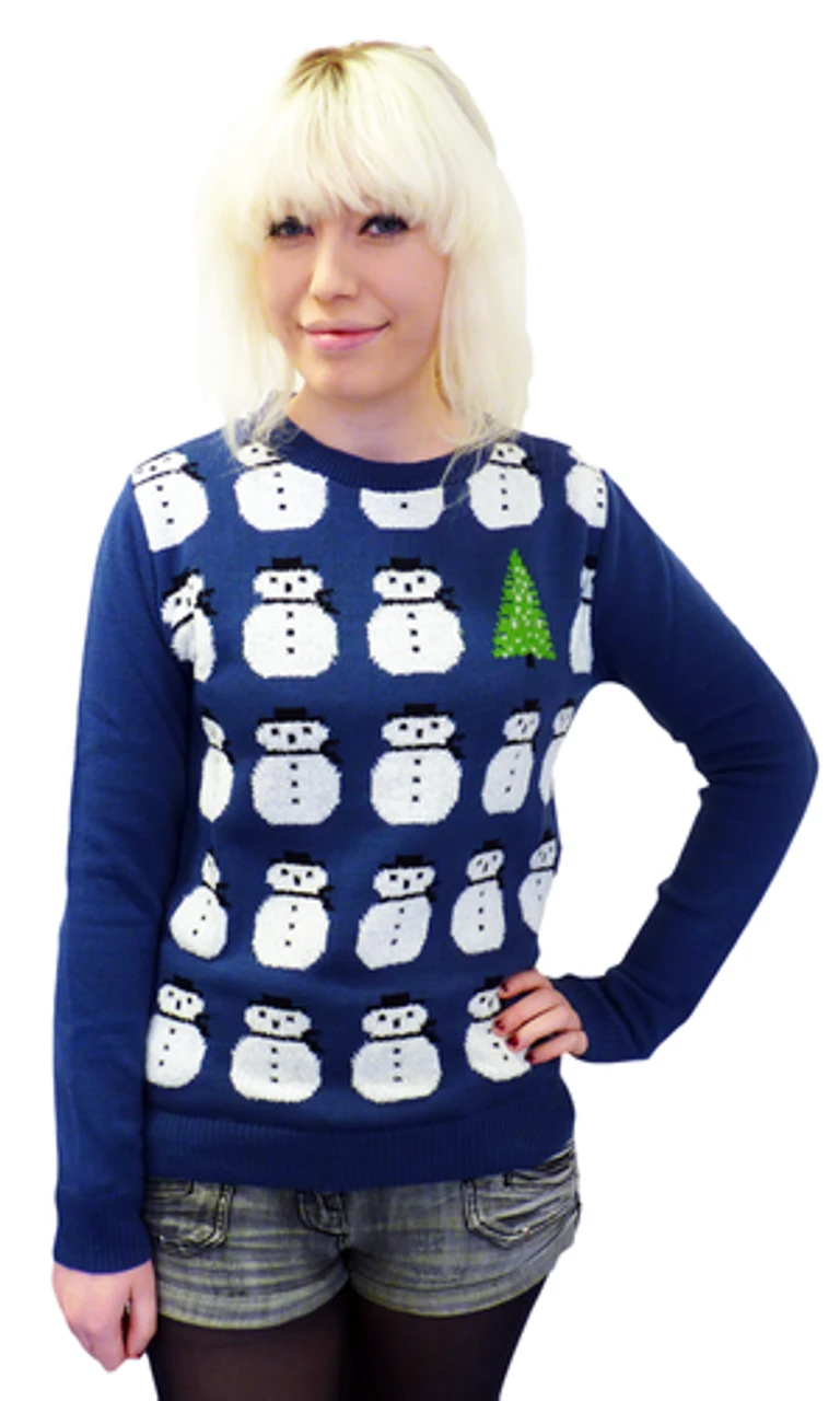 ‘FROSTY’ WOMENS RETRO SEVENTIES INDIE KNITTED SNOWMAN CHRISTMAS JUMPER – Retro knitted Christmas Jumper in airforce blue with white snowman intarsia knit throughout the front panel accompanied by a solitary Christmas tree. Plain sleeves and reverse, ribbed cuffs, collar and hem. Crew neck, Vintage knit style and an old skool Indie classic.