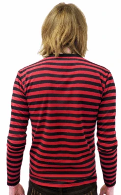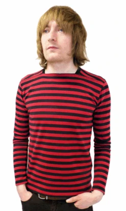 ‘KING BEE’ MENS SIXTIES MOD ATOM NECK STRIPED RETRO T-SHIRT by MADCAP ENGLAND – Mens claret and black Retro striped T-shirt. Mod Brian Jones styling with an innovative Atom Neck. The standard crew neck is cleverly interjected with a straight bar line that crosses from one shoulder to the other. Long sleeve, lightweight and ideal for the Spring/Summer. ‘King Bee’ is destined for the spotlight. Take it along with you!