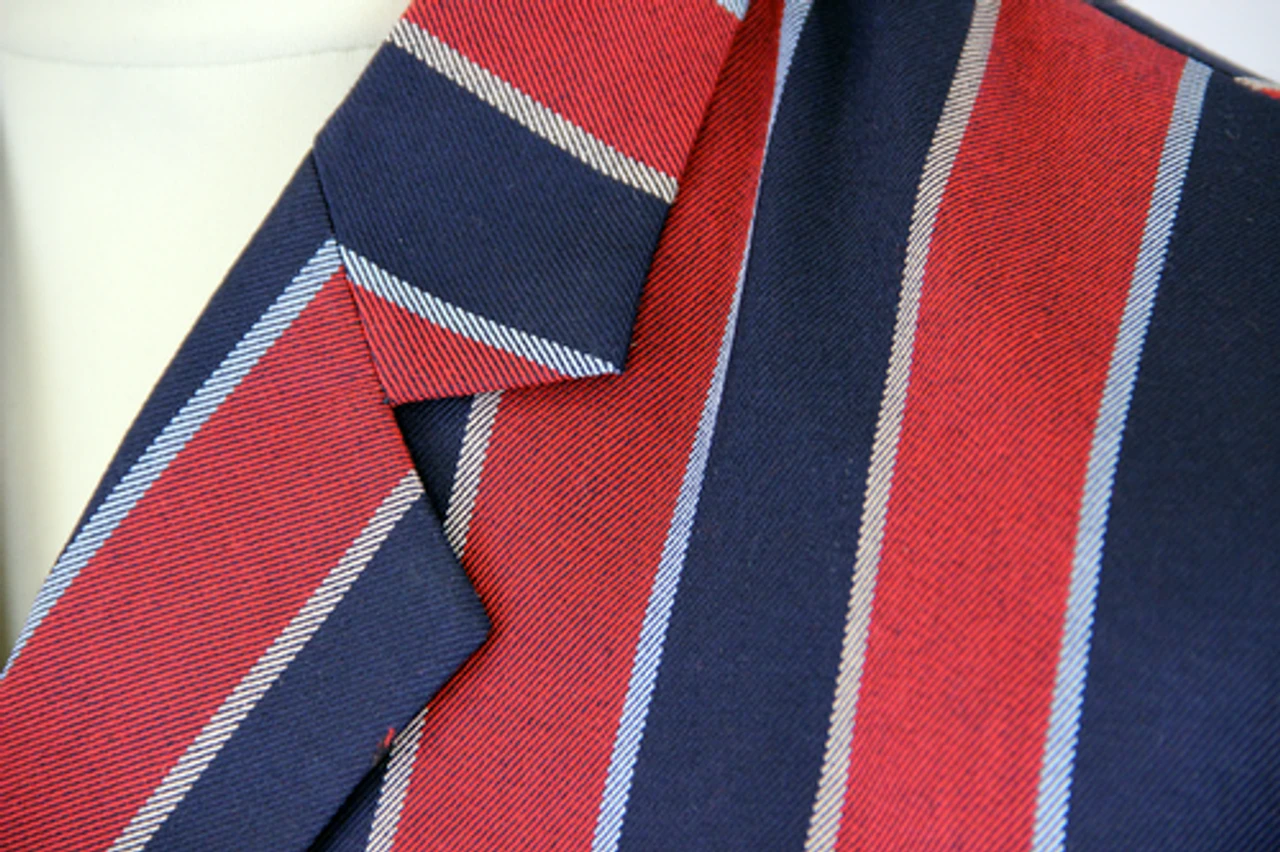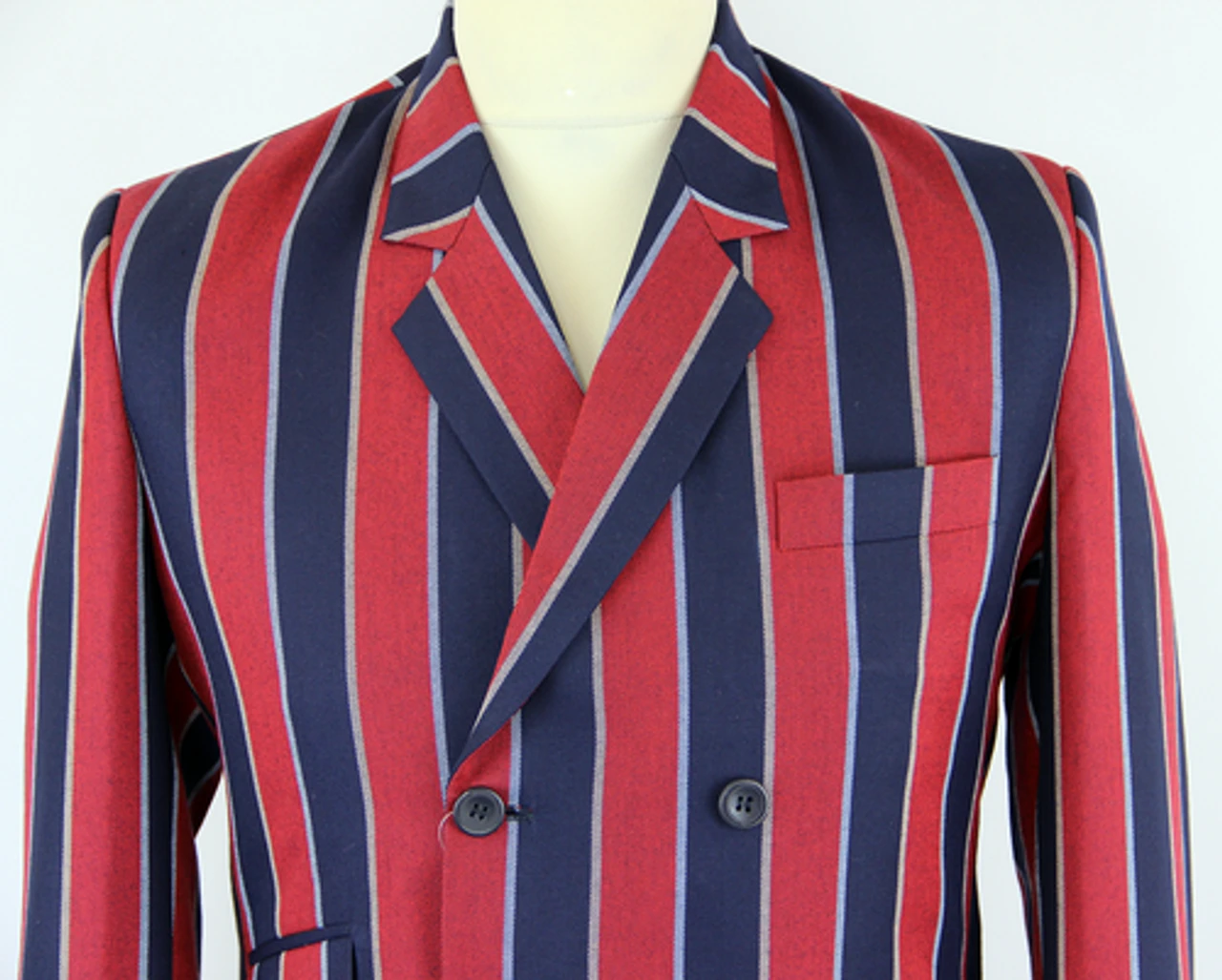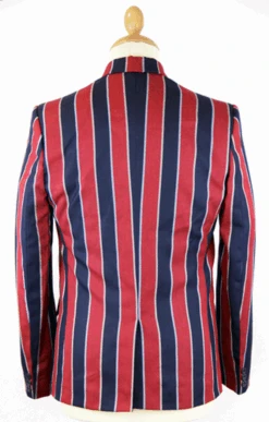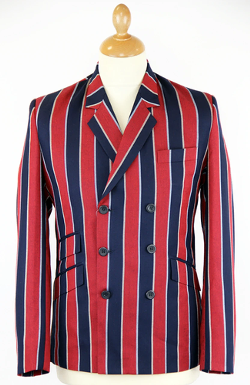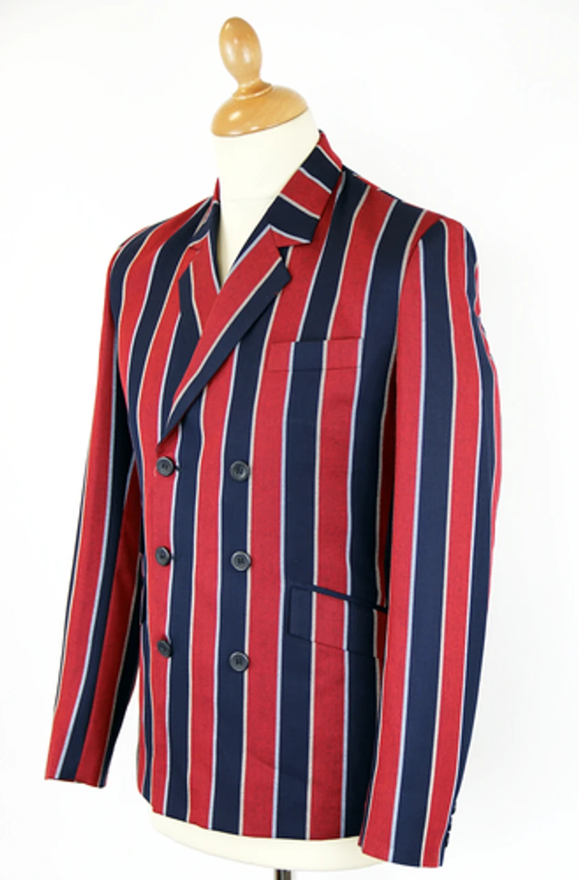 ‘LIGHTNIN’ RETRO SIXTIES MOD WIDE STRIPE DOUBLE BREASTED BOATING BLAZER by MADCAP ENGLAND – Mens red and blue Mod wide stripe Double Breasted Boating Blazer that is complimented by a finer stripes in off white and sky. The trademark Madcap England diagonal stripe runs through to add a neat Vintage texture. Slim Retro notch lapel, double breasted with 3 button fasten. Two flap side pockets, plus classic Mod right side ticket pocket, 3 button detail to the non-working cuffs. ‘Lightnin’ Mod Double Breasted Boating Blazer by Madcap England.