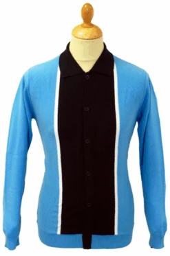 ‘MARRIOTT’ – RETRO MOD SIXTIES MENS BUTTON THROUGH POLO BY MADCAP ENGLAND – Madcap England Mens button through Polo in light blue and navy with white stripe to front. Button fasten with polo collar. Long sleeve. Ribbed cuffs and hem. Slim fit. Tonal embroidered Madcap England branding to sleeve at cuff.
