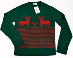 ‘RUN RUDOLPH RUN’ MADCAP ENGLAND MENS RETRO INDIE CHRISTMAS JUMPER – Limited Edition ‘Made in England’ Bottle Green crew neck knitted jumper with ribbed hem, collar and cuffs. Winter wooly style Christmas Jumper with Retro Fair Isle pattern and Reindeer design in Red. Great festive colours.