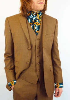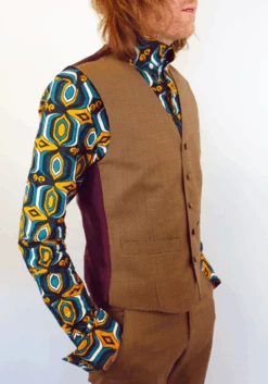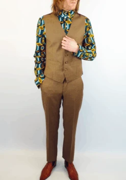 MENS RETRO SIXTIES MOD DOGTOOTH V-NECK WAISTCOAT TAILORED by MADCAP ENGLAND – Mens taupe and brown Retro waistcoat with cool Vintage deep burgundy colour twist. Sixties Mod covered buttons, single breasted V-neck style. Two pockets to sides, contrast burgundy back panel.
