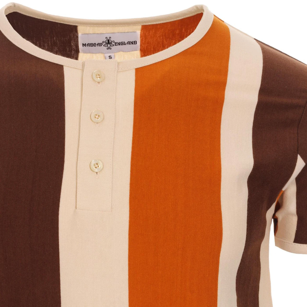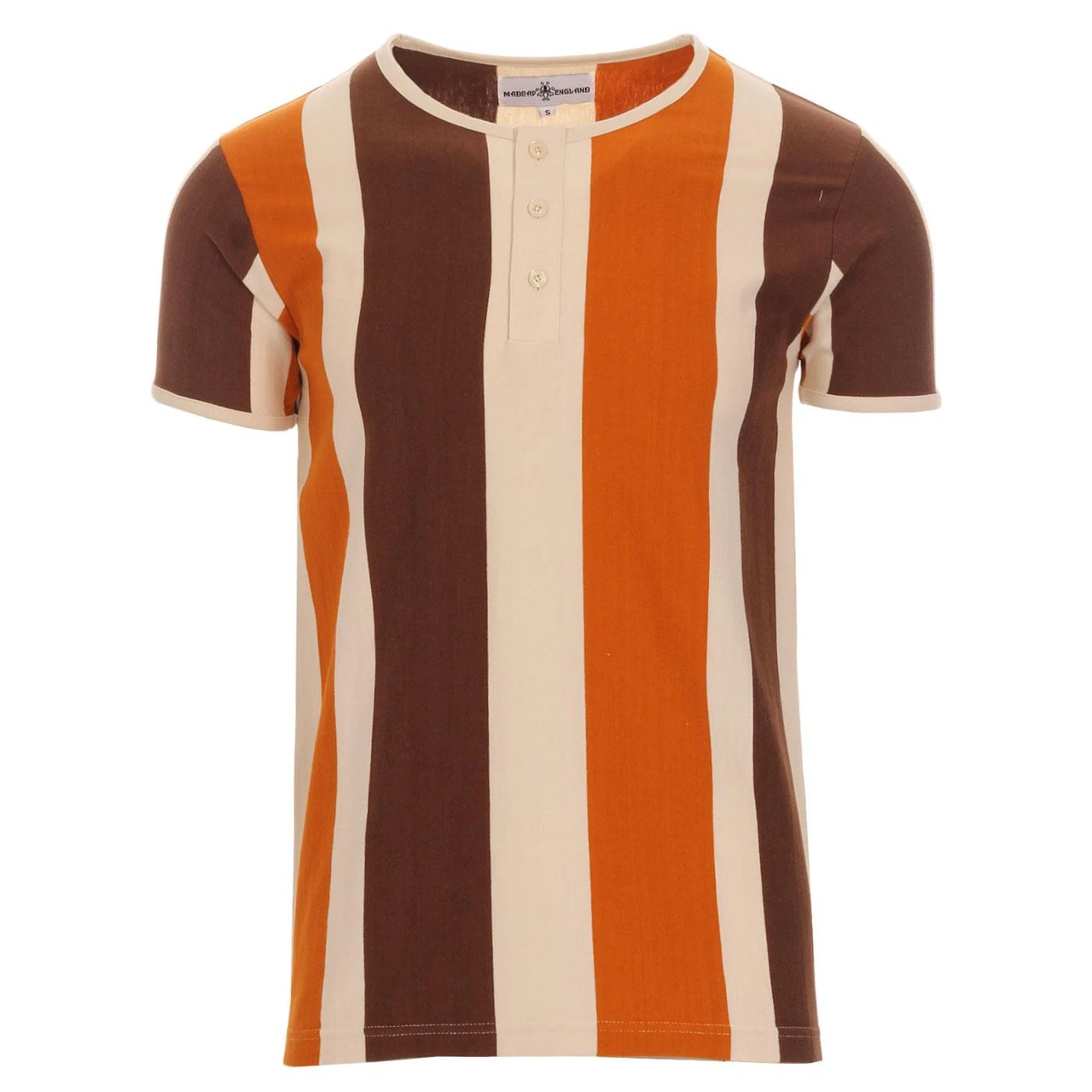 - Madcap England ‘Winston’ men’s retro stripe grandad tee.